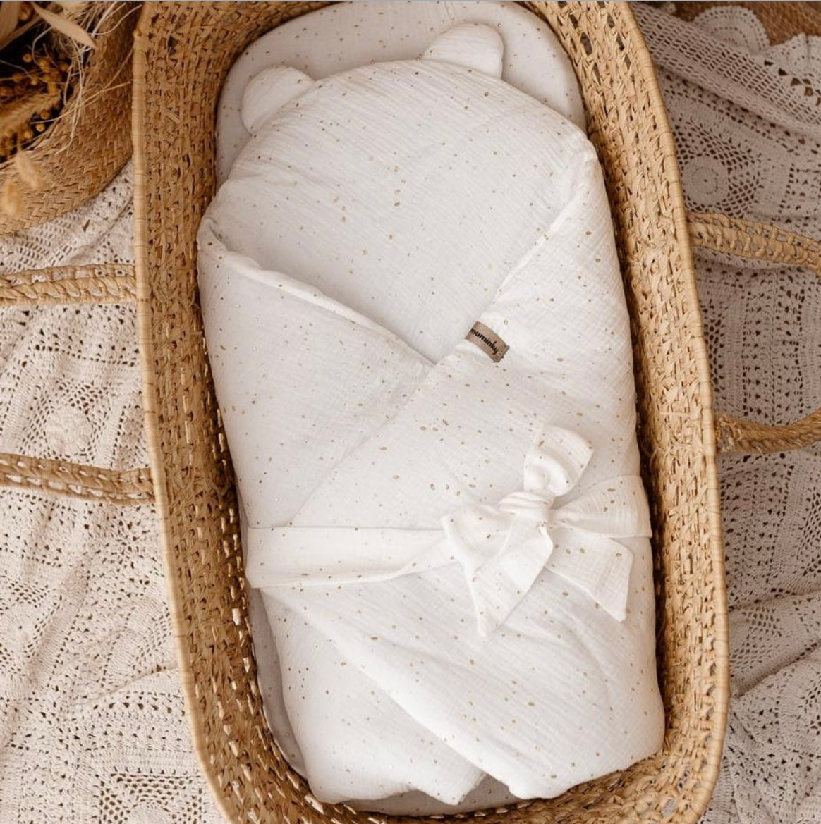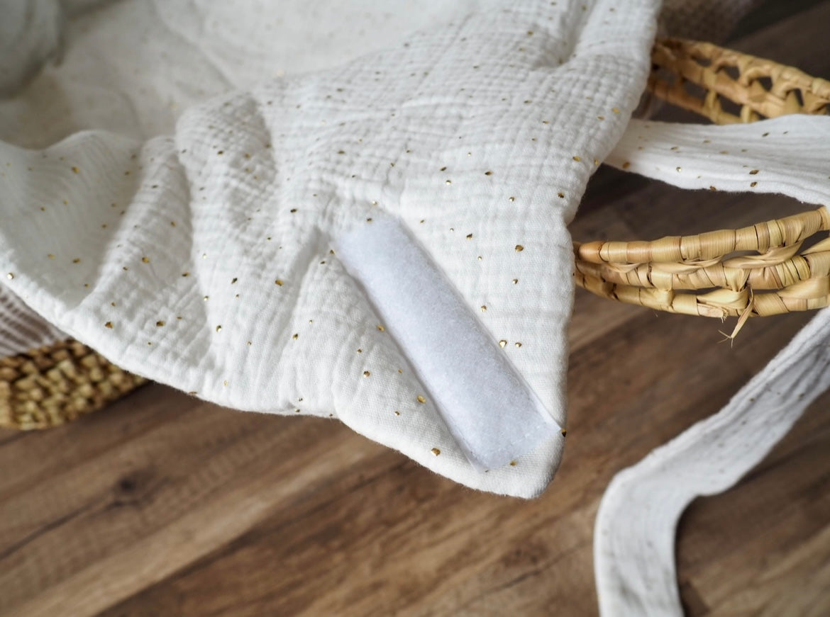 Foret babysvøb i 100% blødt og lækkert musselinbomuld samt varmeregulerende antiallergisk for. Svøbet har blød justerbar burretape-lukning samt medfølgende bindebånd, for tryg og bekvem svøbning af barnet.