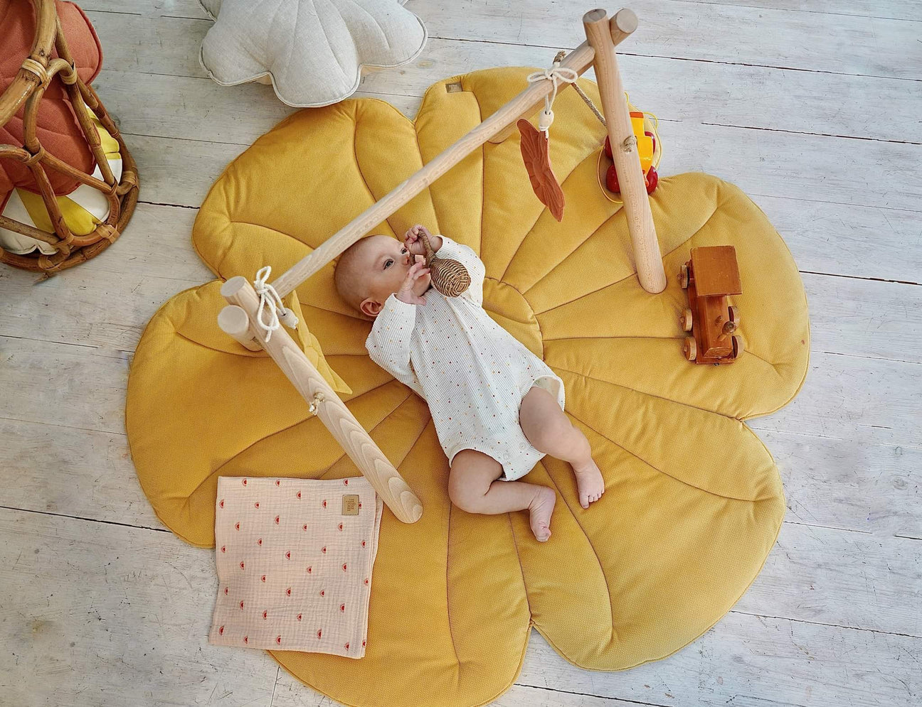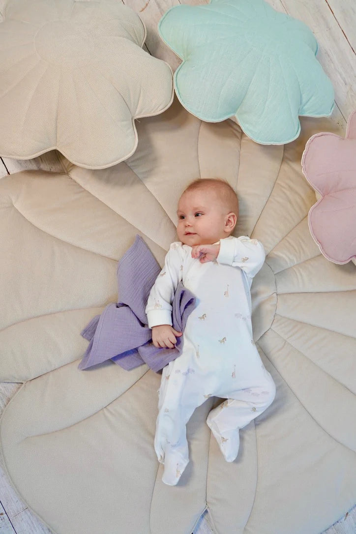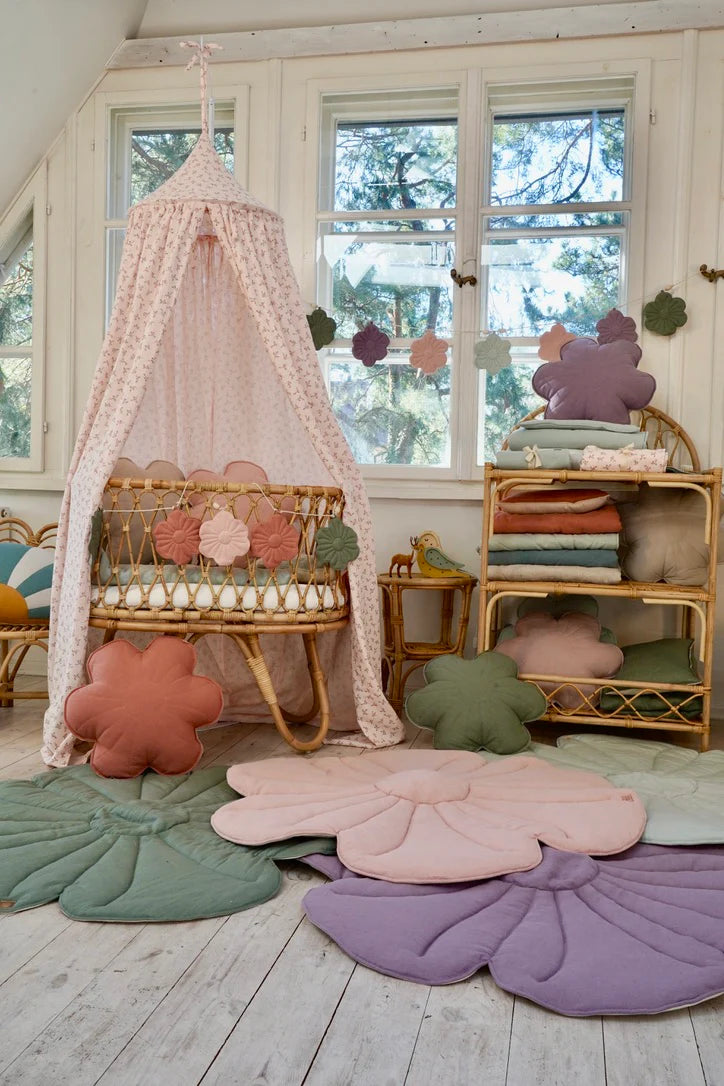 Blomstermåtten fungerer som et fantastisk behageligt tæppe i børneværelset, kan tjene som en tilføjelse til et legetelt, underlag under en baldakin, som smuk vægdekoration eller som sødt indslag i stuens legehjørne. Den kan også bruges til leg i haven eller til sommerens picnics.