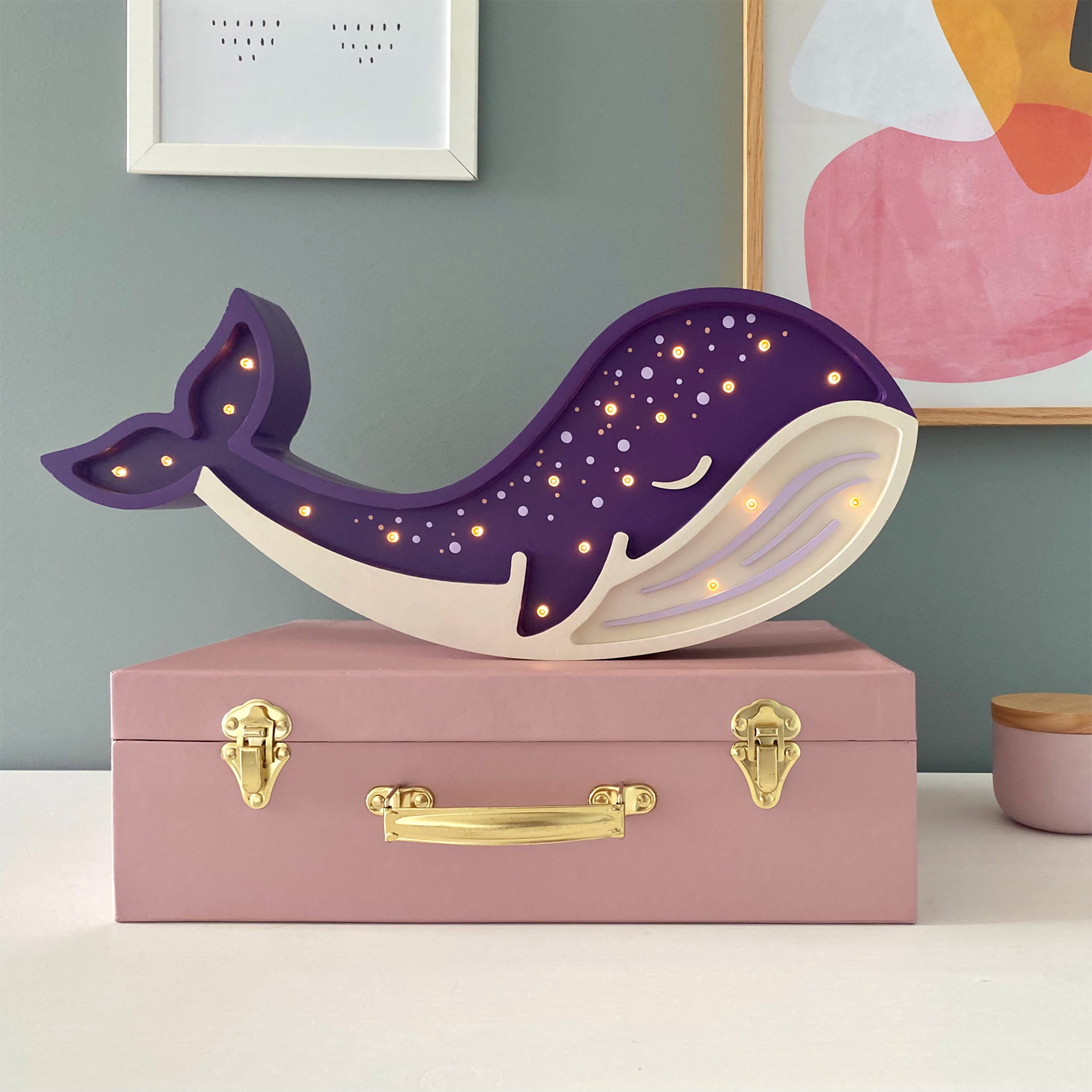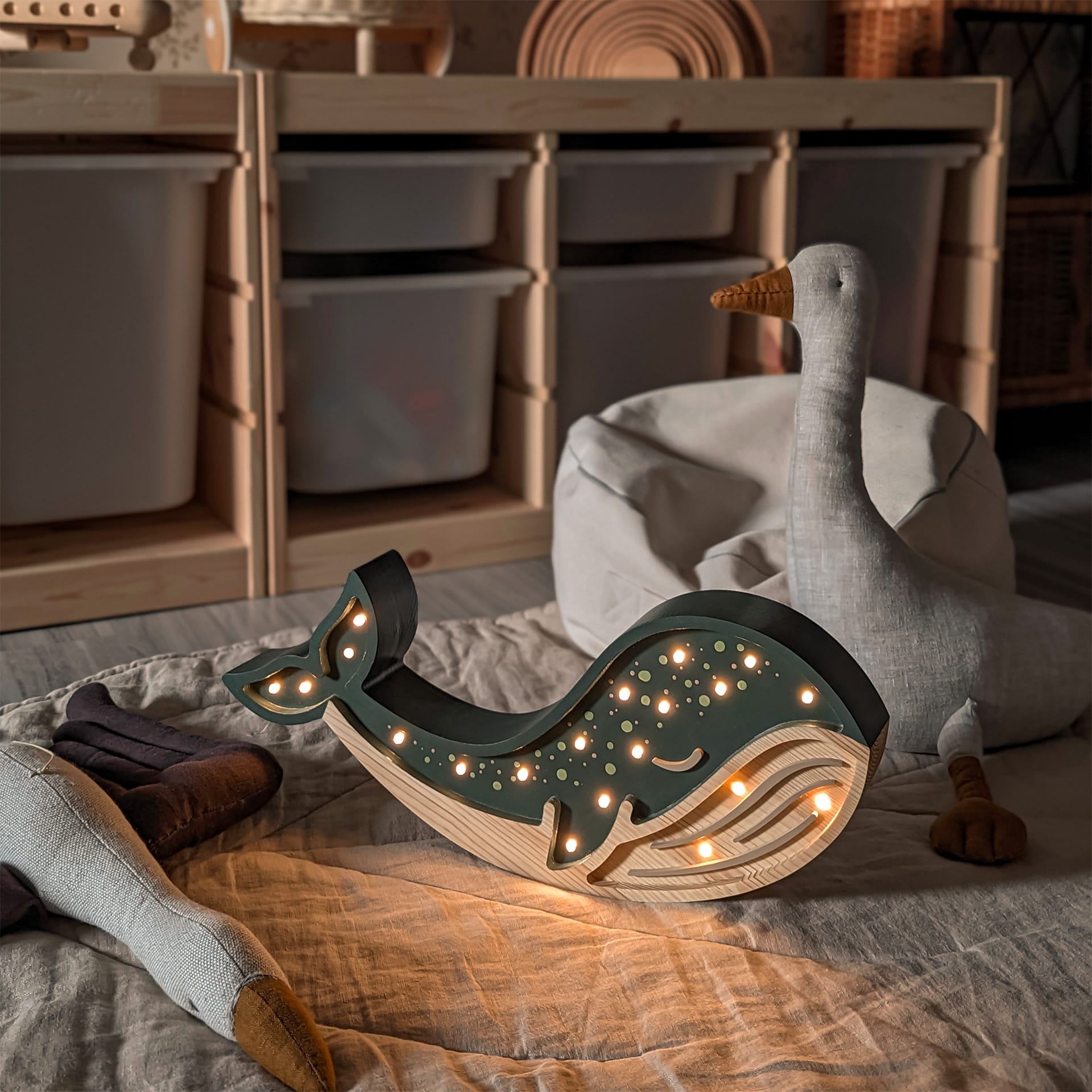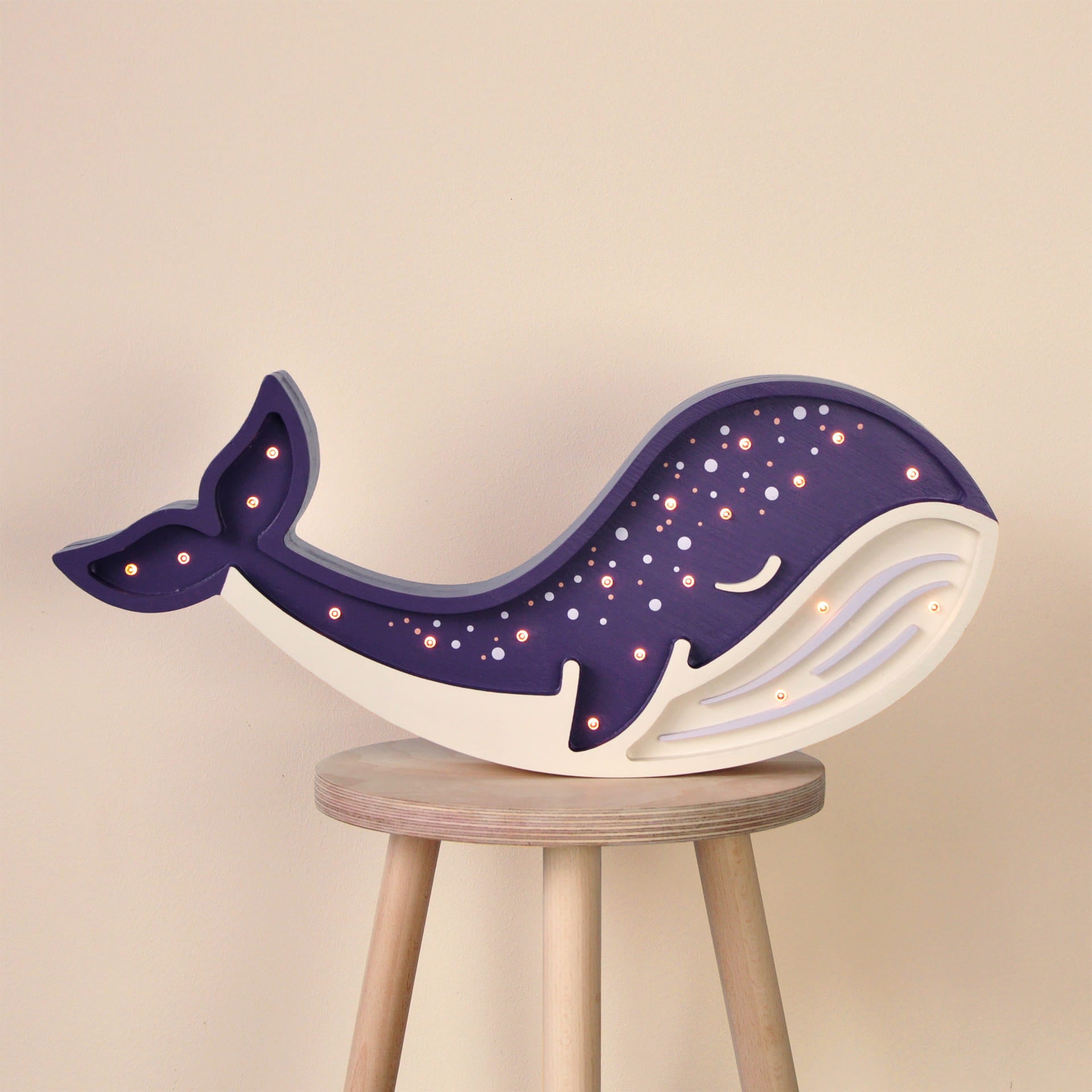 Transporter dit barn til havets dybder med den hvalformede natlampe. Denne yndige sengelampe vil være en fantastisk tilføjelse til dit lille barns værelse. Den er lavet af materialer af højeste kvalitet og giver både sikker og skånsom belysning til sengetid.