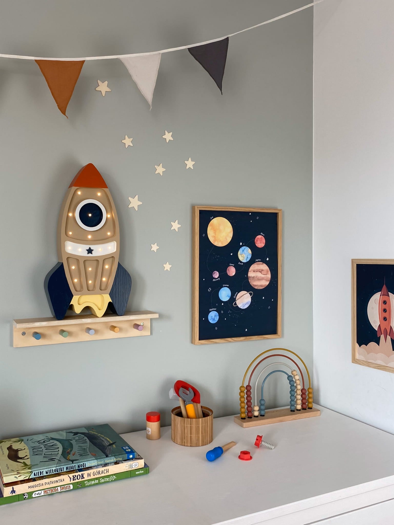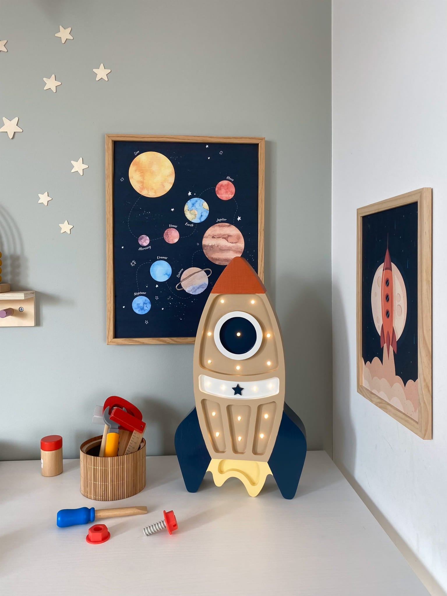Den yndige raketformede natlampe er den perfekte tilføjelse til dit barns værelse. Håndlavet af massivt fyrretræ fra de polske skove, giver denne raketlampe behagelig og blid belysning ved sengetid og er et godt alternativ til traditionelle sengelamper.
