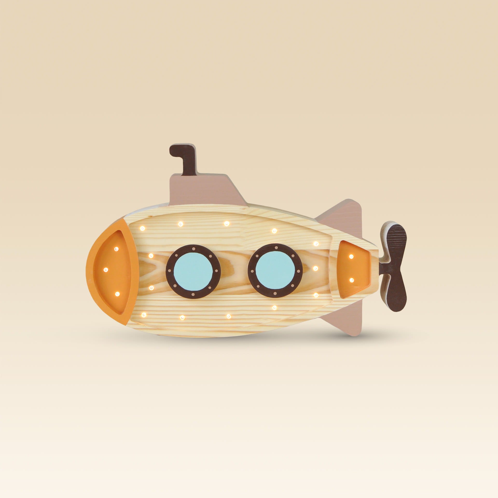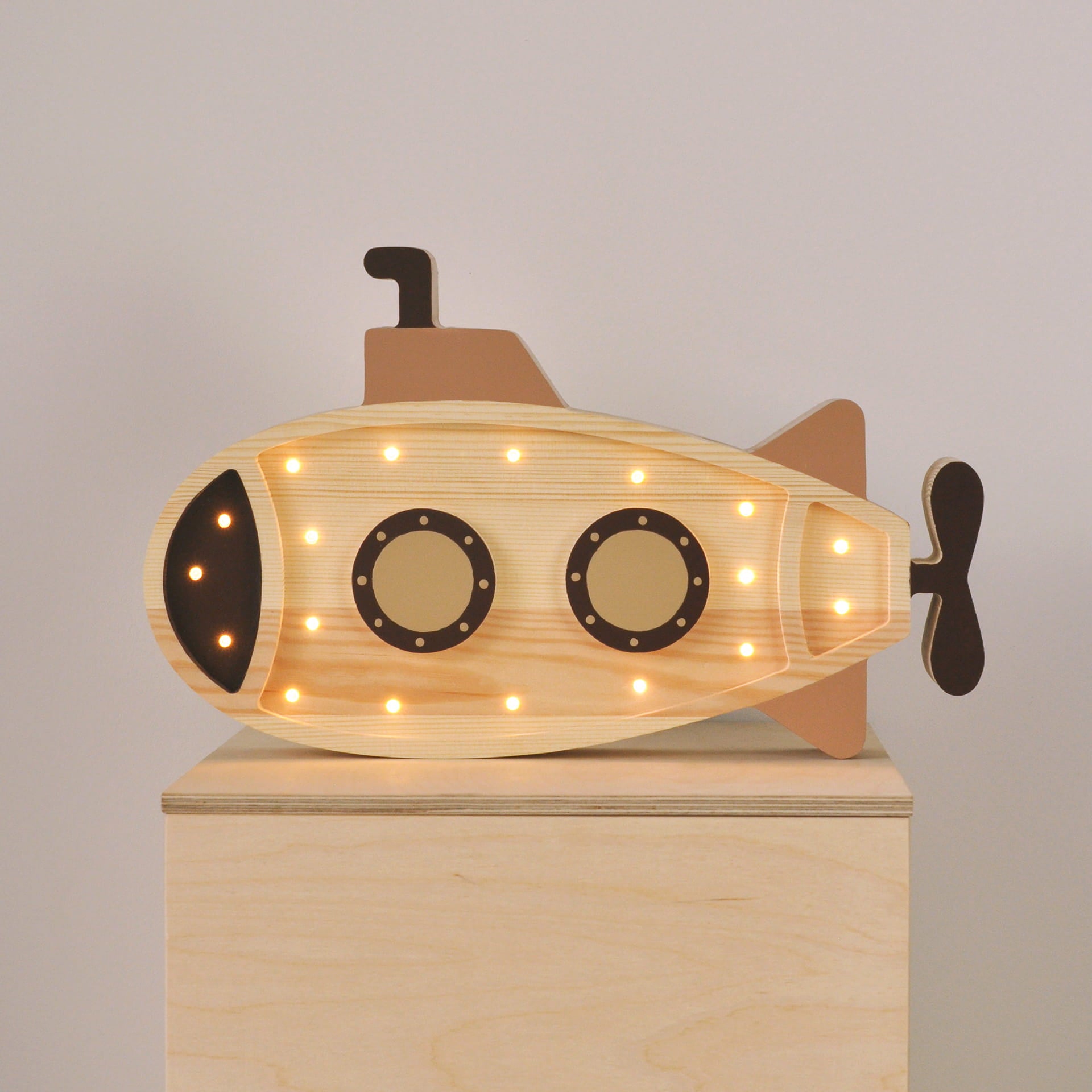 Denne charmerende ubådsformede natlampe er håndlavet af massivt fyrretræ fra polske skove. Takket være sit unikke design er ubådslampen den perfekte tilføjelse til dit barns værelse. Det giver behagelig og delikat sengetidsbelysning, der vil skabe en magisk atmosfære og genoplive dit lille barns fantasi.